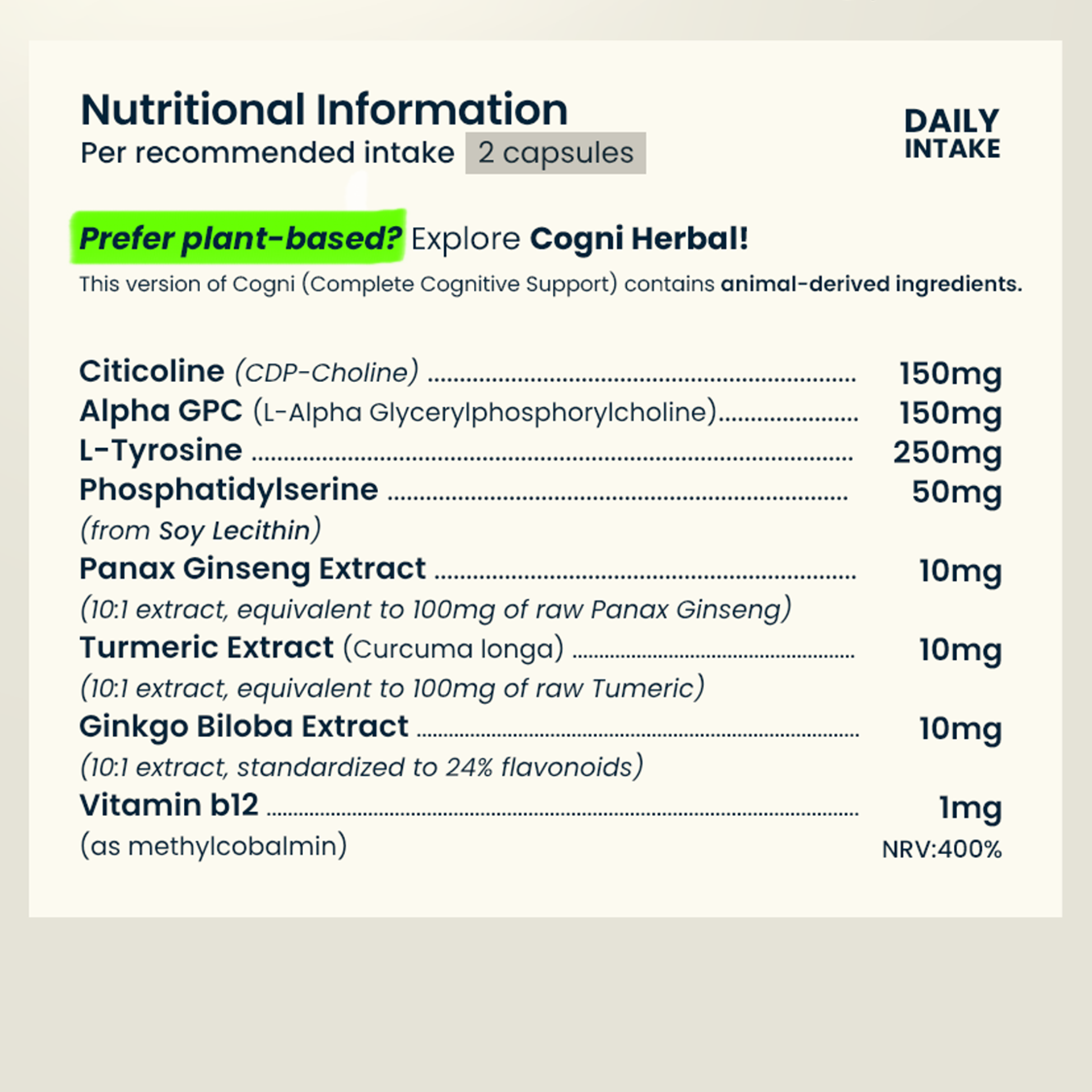 This version of Cogni contains artificial and animal-derived ingredients.