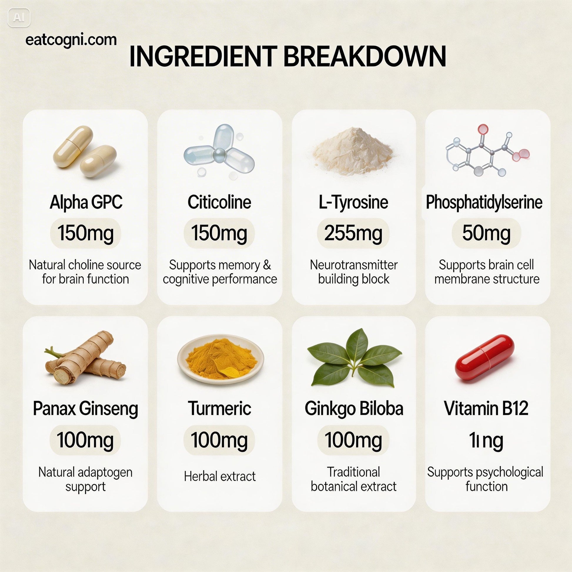 This exact blend is designed for peak cognitive harmony – targeting focus, memory, stress resilience, and neural repair simultaneously. Cogni leverages the synergy of these potent, research-backed nootropics and neuroprotectants to elevate mental performance cleanly, without crashes.